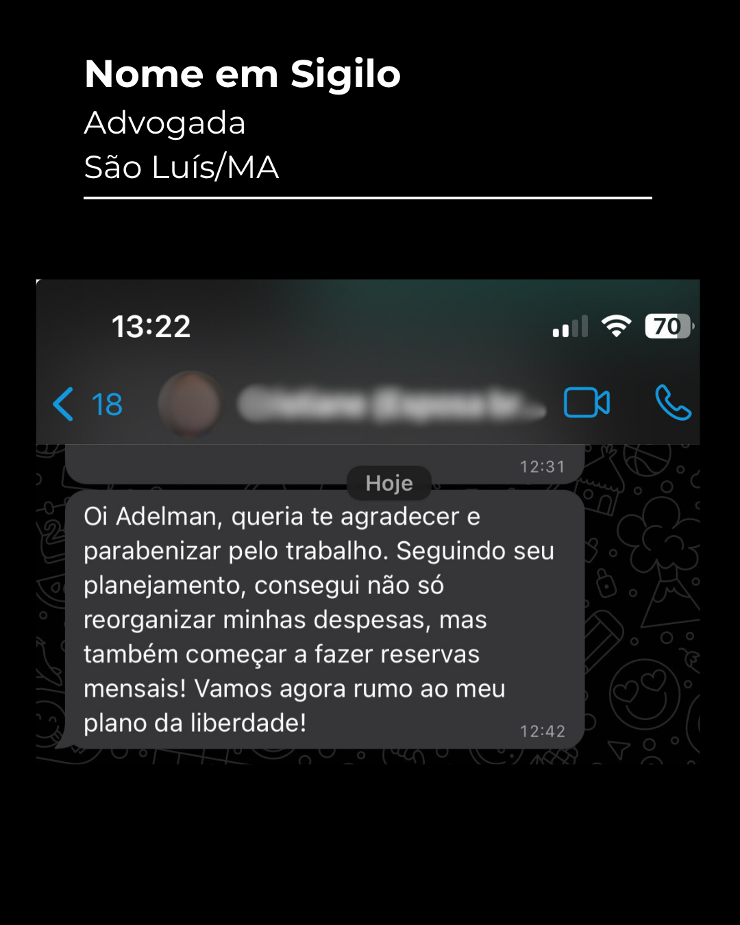 Hoje, ajudo pessoas que ganham bem, mas não acumulam patrimônio, a organizar sua vida financeira, criar um plano claro e finalmente ver seu dinheiro trabalhando por elas.